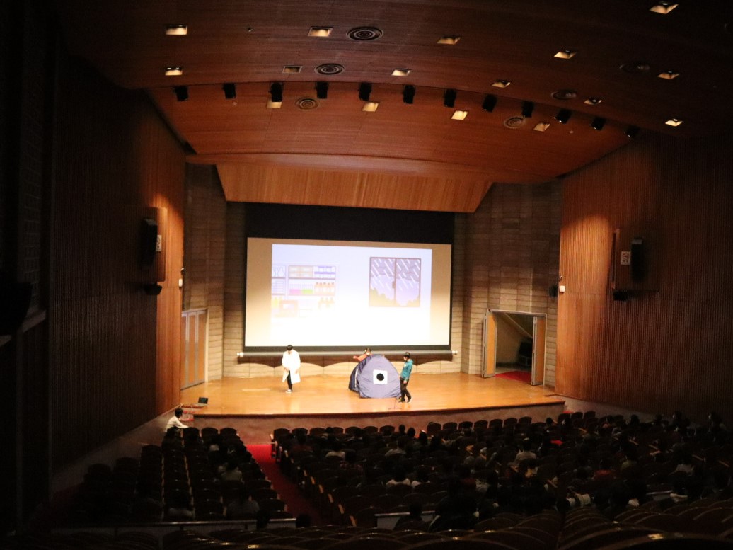 大勢の子どもたちの前でサイエンスショーを行います。科学的に面白い内容であるのはもちろんですが、ストーリーとしても面白いものとなるように工夫しています。